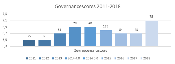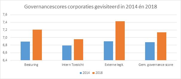 Zoals te zien is in bovenstaande grafiek zijn de prestaties op alle onderdelen van governance verbeterd ten opzichte van de vorige visitatie vier jaar geleden. Uit een inhoudelijke analyse van de visitatierapporten blijkt dat de corporaties die een grote verbetering (> 1 punt) laten zien actief aan de slag zijn gegaan met de verbetersuggesties die er tijdens de vorige visitatie zijn gedaan. Een verbetering van (één of meer onderdelen van) de PDCA-cyclus, de naleving én doorleving van de governancecode, het aanscherpen van de rolopvatting van de raad van commissarissen en het structureren van de externe legitimatie zijn punten die in meerdere rapporten worden genoemd.