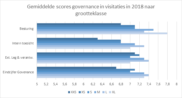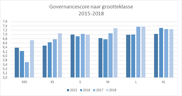 Uit de cijfers blijkt opnieuw dat de grote corporaties (L, XL) beter scoren dan de overige corporaties. De corporaties in de categorie XS (minder dan 2.500 vhe) laten een gestage opwaartse ontwikkeling zien. Als ze deze lijn vast kunnen houden dan haken ze aan bij de middelgrote corporaties. De governance van de kleinste corporaties (XXS, minder dan 1.000 vhe) is ten opzichte van 2017 weliswaar flink verbeterd, maar vanwege hun geringe aantal in de visitaties 2018 is het te vroeg om te spreken van een inhaalslag. Kleine corporaties (XS en XXS) zijn nog steeds oververtegenwoordigd onder de onvoldoendes voor governance, met name op het gebied van intern toezicht.