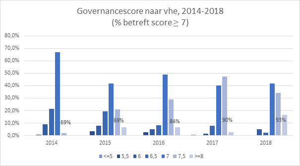 Door de governancescore te wegen naar het aantal verhuureenheden van de corporatie wordt zichtbaar bij welk percentage woningen (lees: huishoudens) welke gemiddelde governancescore hoort. Vanuit de huurder gezien is de governance de afgelopen jaren aanzienlijk verbeterd. Het aantal huishoudens dat een woning huurt van een corporatie die een score van 7 of hoger heeft, is de afgelopen jaren gestegen van 69% in 2014 tot 93% in 2018. Dit komt doordat vooral de grote corporaties beter scoren op het gebied van governance.